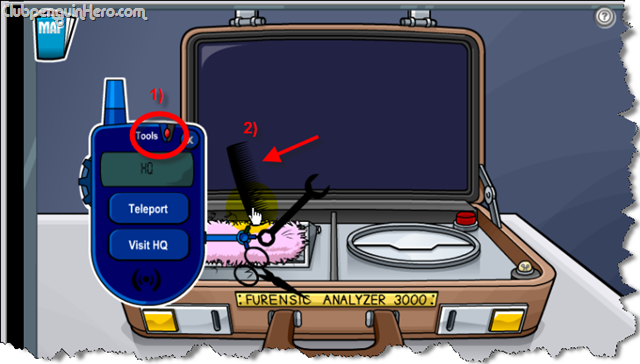 You take your Spy phone and then choose the comb to straighten the sample of the fur so that it slids easily throught the analyzer. Once it slids, the analyzer verifies it is a sample of a pink puffle's fur.