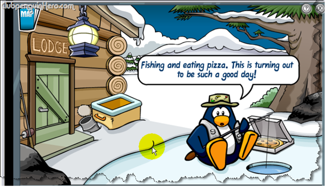 Go to the Fishing area and deliver the pizza to the blue penguin fishing there.